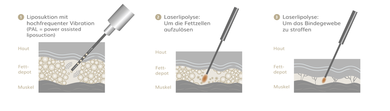 - Hochfrequenz-Liposuktion / PAL (power assisted liposuction): Es erfolgt mittels Vibration ein Entfernen der Fettzellen, ohne das Bindegewebe zu strapazieren oder zu zerreißen. Ein aggressives Absaugen mit schnellen Armbewegungen wird vermieden.
